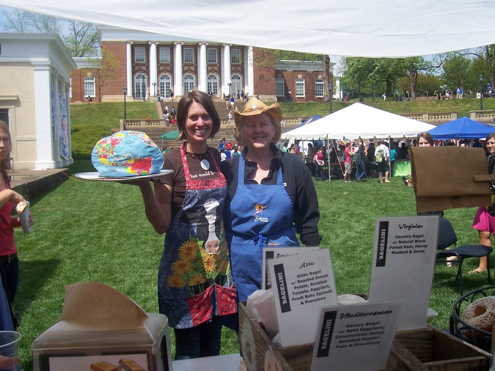 **Thursday, 40th Earth Day: UVA was loads of excitement as Bruce Edmonds and I did a remote broadcast in front of Newcomb Hall and then at the Amphitheater by the lawn – the Ecomarket with students, faculty and staff. LOVED Bruce’s ECO-radio with a hand crank! The local bagel ladies were there as well as Retail Relay, Beer Run, Edible magazine, Habitat for Humanity, farmers, Feast! Earth lovers at large, let me tell you. THANKS to those of you who signed up to volunteer. Betty needs YOU!! Thanks for the interview Myles Henderson: http://www.newsplex.com/video?clipID=4725265&autoStart=true&contentID=91838494